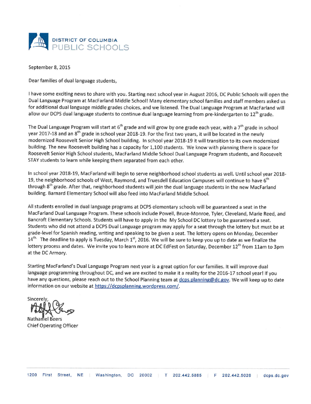 The DCPS Planning Team is excited to announce the “jump start” of MacFarland Middle School’s Dual Language Program next school year. Please see the letter below from DCPS Chief Operating Officer Nathaniel Beers for details, or click on the pdf link here: MacFarland SY1617 Start Letter.