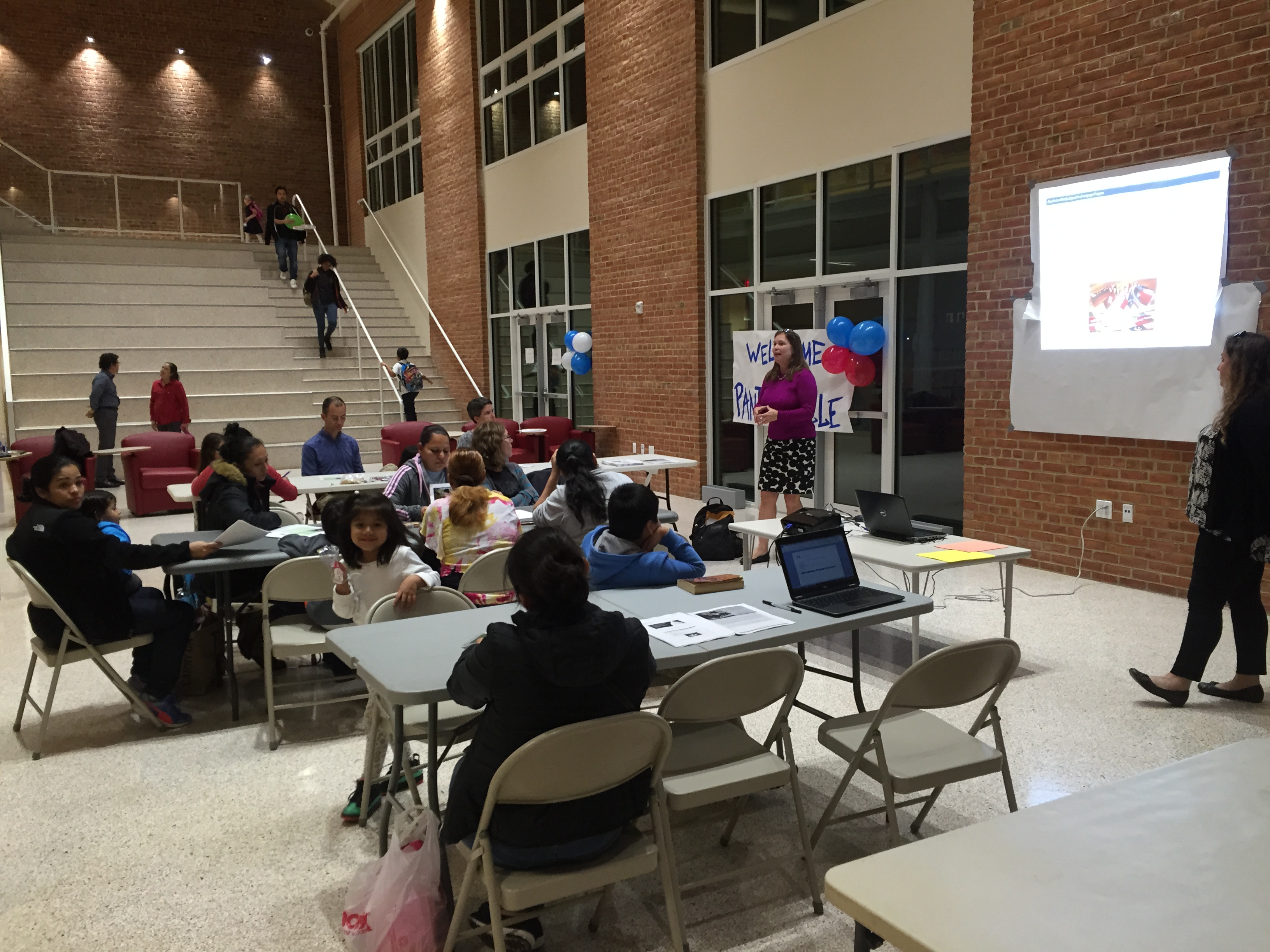 110315 MacFarland at PowellKatarina Brito (top, purple) and Rosanna de Mammos (right) from DCPS’ Language Acquisition Division discuss MacFarland’s Dual Language Program with parents at Powell Elementary School on Tuesday, 11/3.