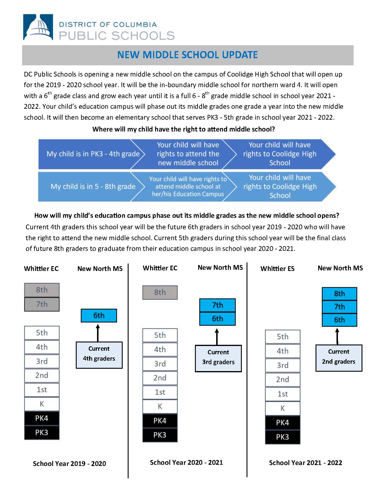 One Pagers for Parents & Families about the opening of New North MS and the redesign of Coolidge HS