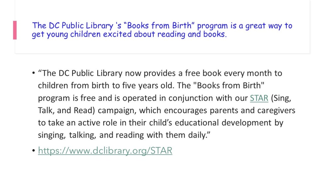 Previously we shared the DC Public Library Books from Birth program with all our enrolled families in our e-newsletter. Families can sign up for a free book each month until their child is 5 years old!