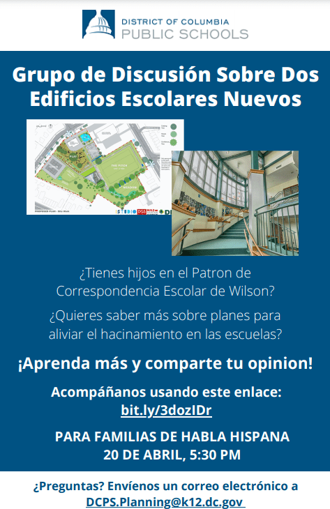 The School Planning Team has coordinated with the Foxhall/MacArthur Community Working Group and select schools within the Wilson Feeder patter to discuss potential options for both the Foxhall and MacArthur sites. The purpose of the meetings are to share an informative overview of our current recommendation and to gather feedback prior to the release of a broader community-wide survey. Please find below a list of scheduled meetings and contact your school of choice if you would like to attend a session. We will also have engagement opportunities for DCPS’s Spanish-Speaking families. Information on that session is also linked below.