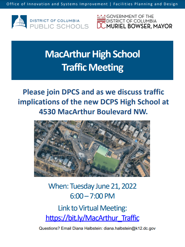 Join DCPS on June 21, 2022 at 6 pm for a virtual community meeting about MacArthur HS focused on traffic. This meeting will review findings of the recently concluded traffic study and other transportation implications associated with the opening of MacArthur HS. This meeting is open to the public.