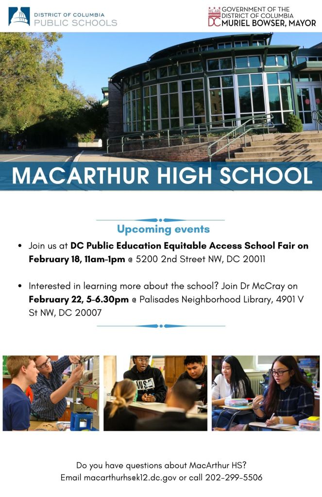 MacArthur High School: Upcoming Events, February 2023 February 15, 2023October 30, 2023dcpsschoolplanning Join us at the DC Equitable Access School Fair on Feb 18 and Palisades Neighborhood Library on Feb 22! This will be an opportunity for prospective students and families to meet with Dr McCray and learn more about the school. Share this: Click to share on X (Opens in new window) X Click to share on Facebook (Opens in new window) Facebook Like Loading... Related